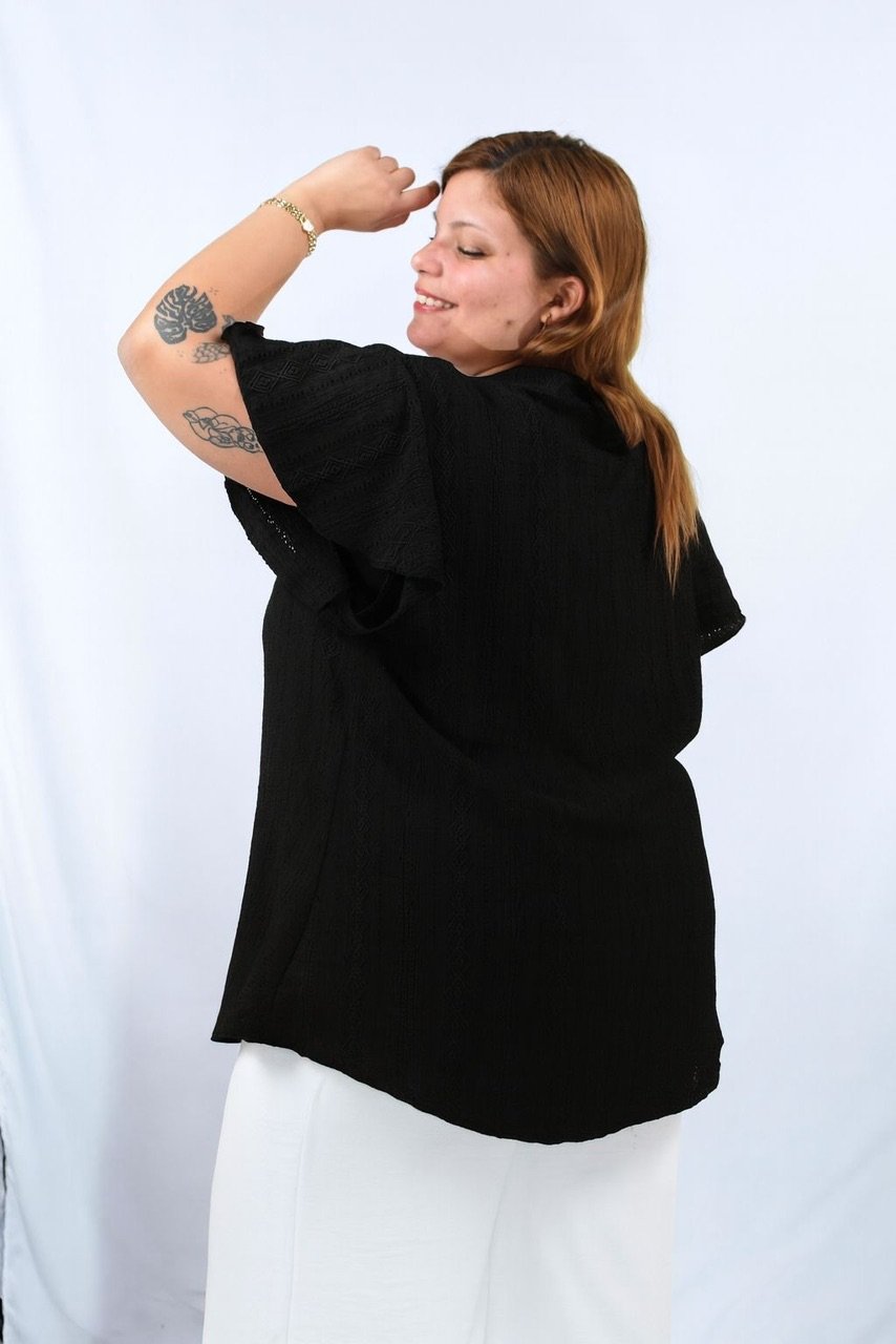 👉Tela broderie, caída evase y cuello V. Con manga mariposa.