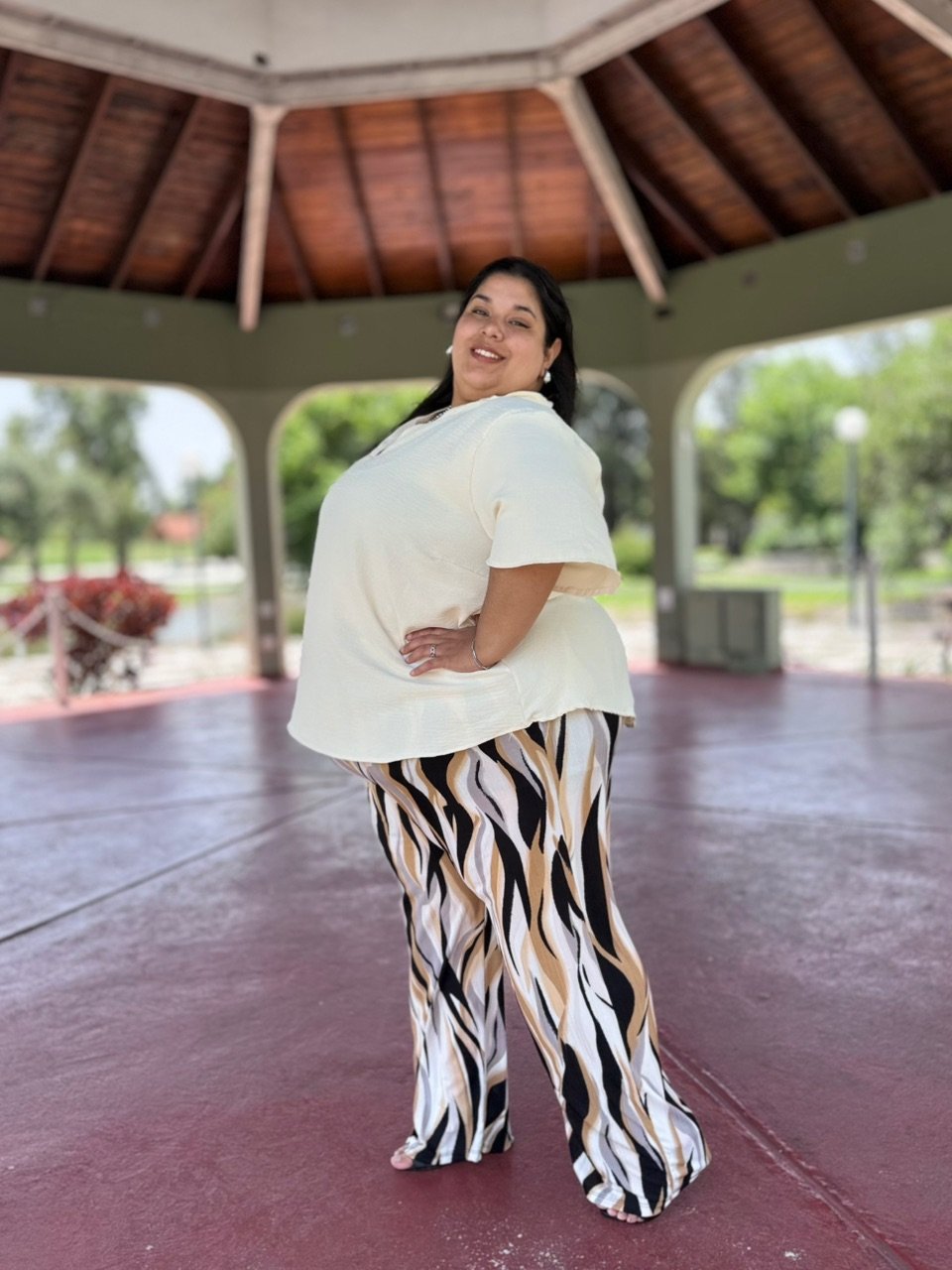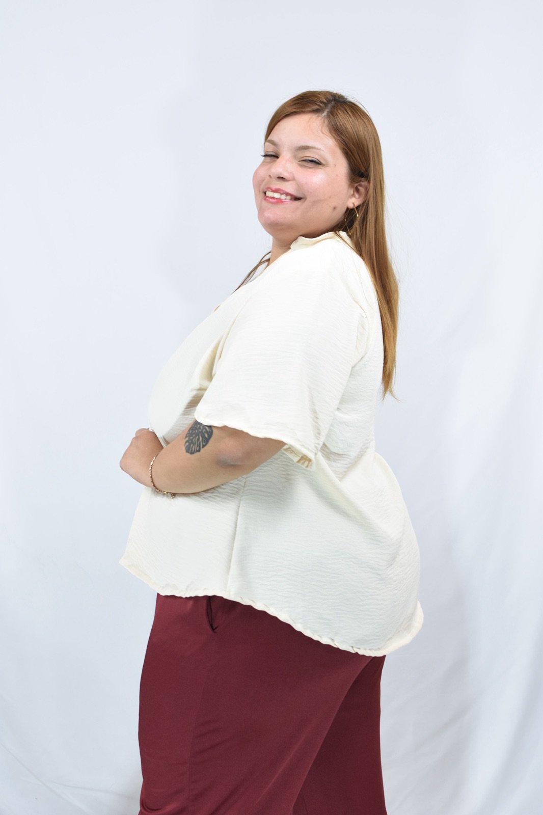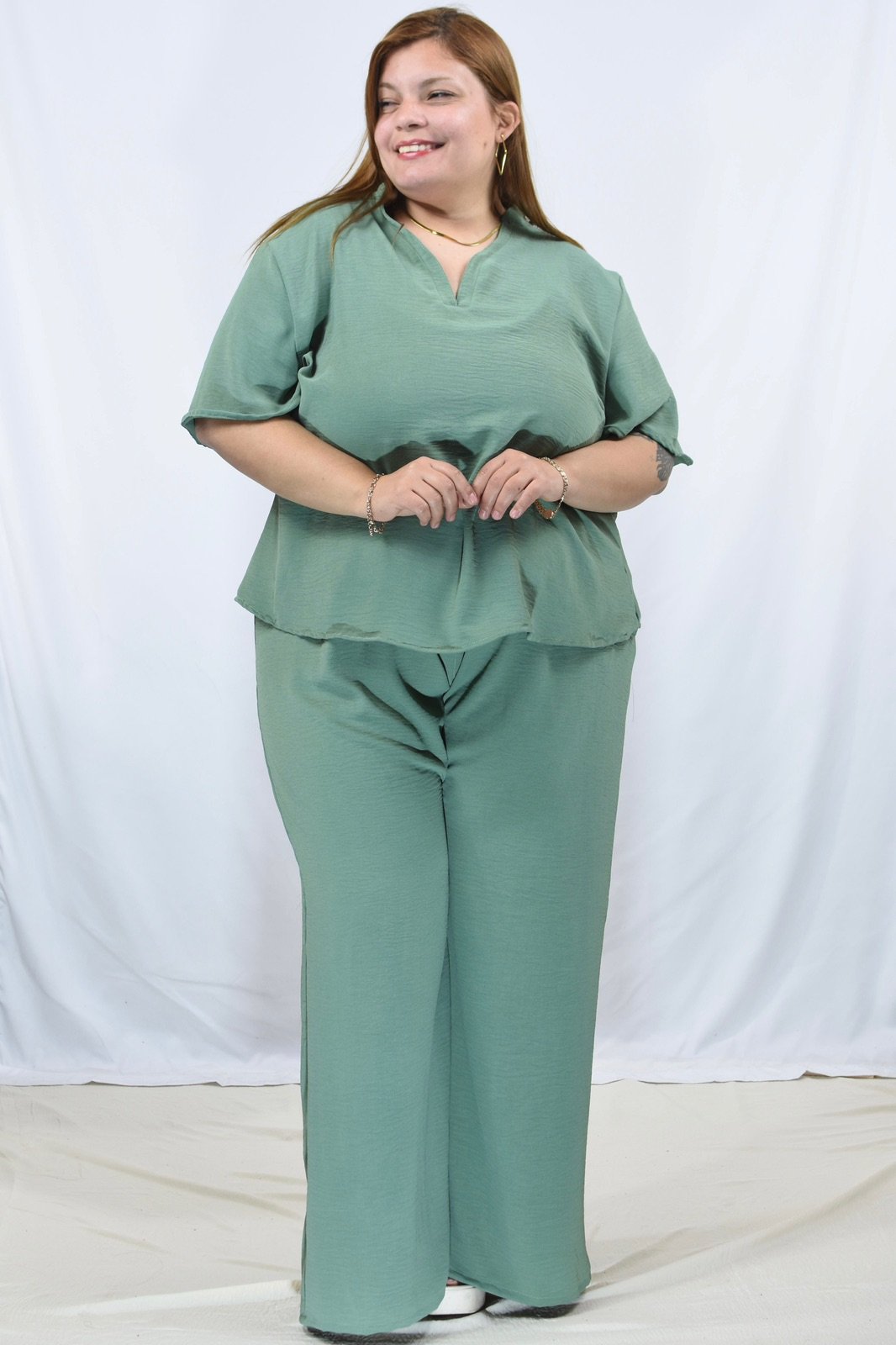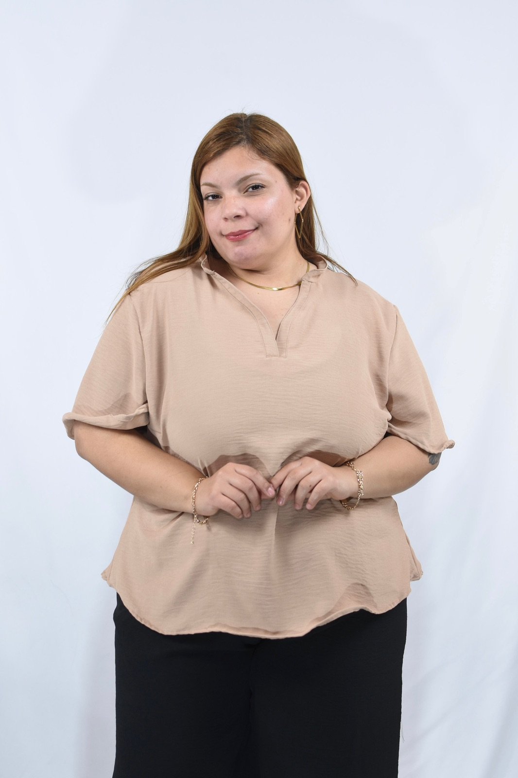 👉Tela Cey Airflow, cuello en V con manga campana.