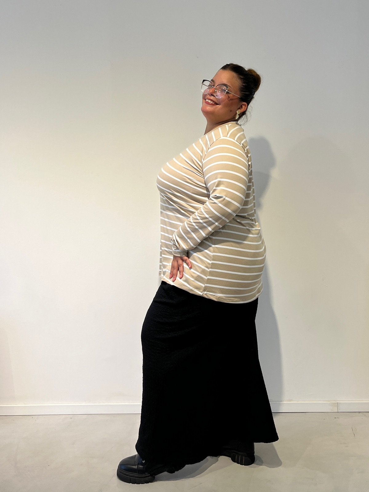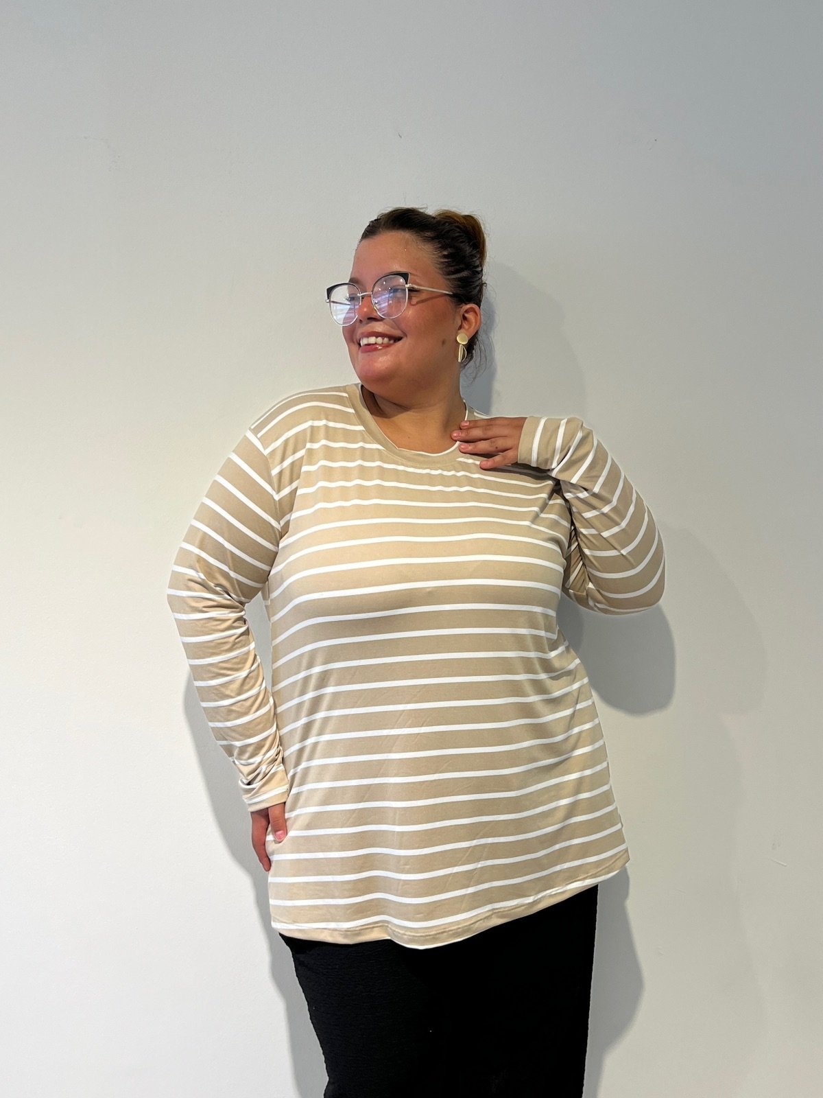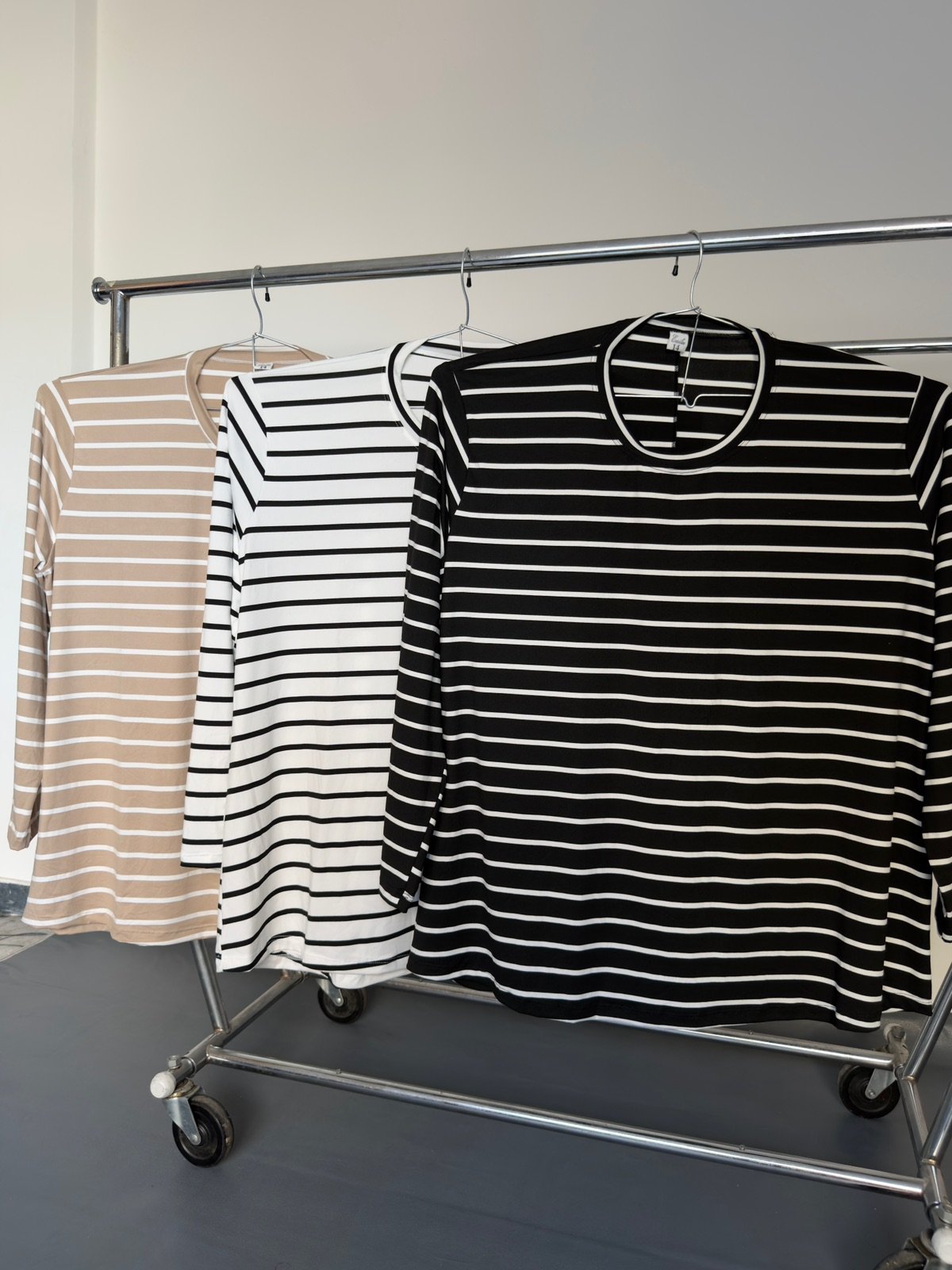 Tela modal soft rayado, cuello redondo caída evase